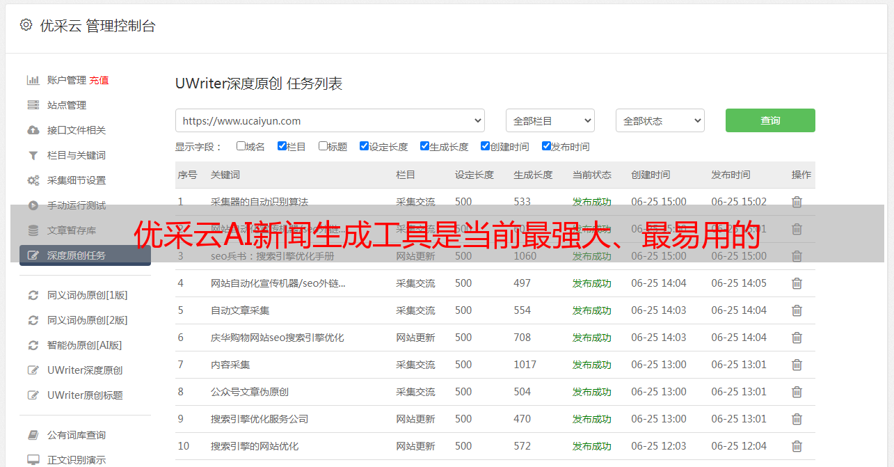 优采云AI新闻生成工具使得人们不再需要花大量时间去手动研究行业动态、未来走势、话题线索、信息资源等;同时也使得人们能够省下大量时间去思考如何将所学习到的信息整理并整合创作出原创性的文章。优采云AI新闻生成工具是当前最强大、最易用的AI新闻生成软件之一!想要尝试一下吗?快来www.ucaiyun.com看看吧~