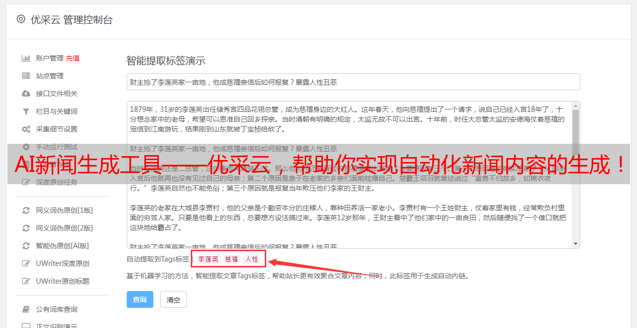 此外,优采云AI新闻生成工具还能够帮助用户在文章中快速找出想要表达的信息和愿望。例如在广告促销中想要表达“物美价廉”、“品质保证”之类的要点时,就可以快速找到相关内容并把它们明显地表达出来。