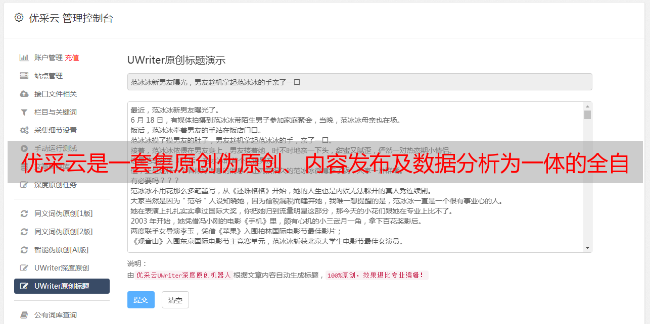 优采云是一套集原创伪原创、内容发布及数据分析为一体的全自动营销软件