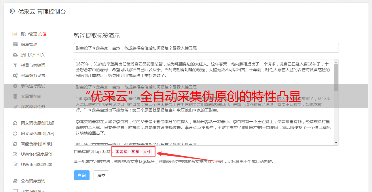 首先,优采云可以帮助用户批量采集原创内容,支持手动、自动多种方式,能够快速实现大批量信息的采集和发布。其次,优采云还支持“伪原创”的功能,即将用户“一键”复制并修改语句、去除标点符号以及对字符进行相应修改,使得用户可以在各大平台上发布出具有一定原创性格的文字内容。