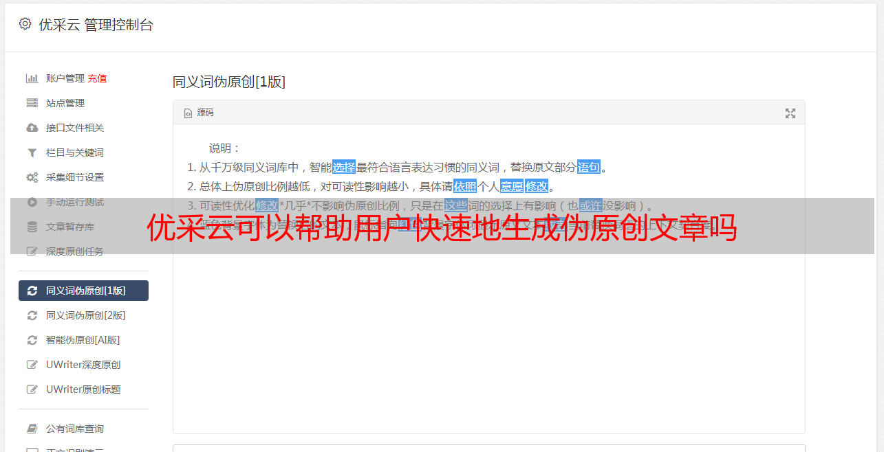 总之,如果你想快速生成一批高质量的原创文章来增强SEO效果,“优采云”就是你不可多得的好帮手。通过“优采云”,由人工无法区分真正原创文章和“伪原创文章”的方法来高效解决创作合要求的问题!想要体验“优采云”的强大功能吗?请前往www.ucaiyun.com马上体验吧!