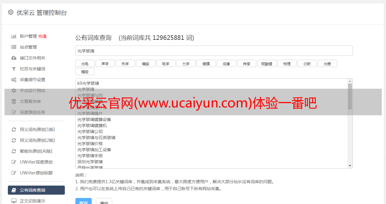 总之,优采云是一款卓越的文字生成工具。无论是电子书写作、广告制作还是学术写作都可以使用它帮助你快速而有效地得到想要的结果。体验一下优采云就能感受到它所带来的便利。如今就上优采云官网(www.ucaiyun.com)体验一番吧!