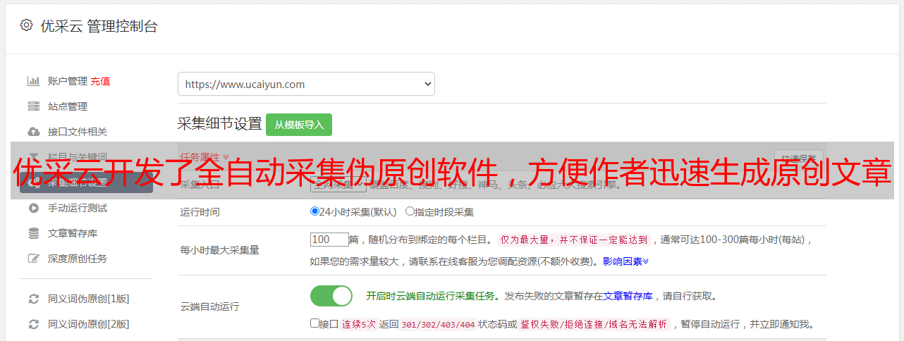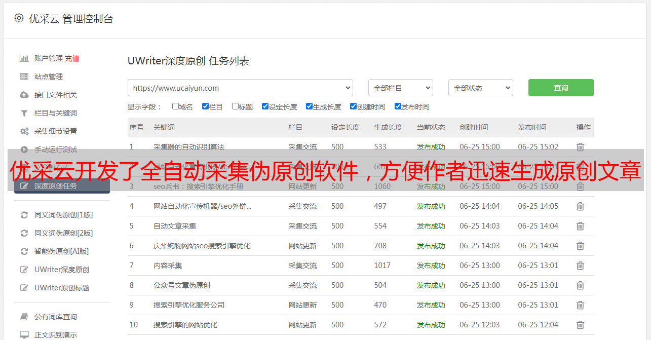 总之,随着优采云全自动采集伪原创工具的出现,告别了手动采集、整理、处理大量信息带来的无尽时间浪费、低效工作方式。不但能够帮助作者快速准确地寻找所需要的内容,而且还能够快速生成原始文章并对其进行伪原创处理。相信优采云将为广大新闻作者、学术*敏*感*词*、SEO人士带来惊喜体验。想要感受一下,就立即前往www.ucaiyun.com注册吧!