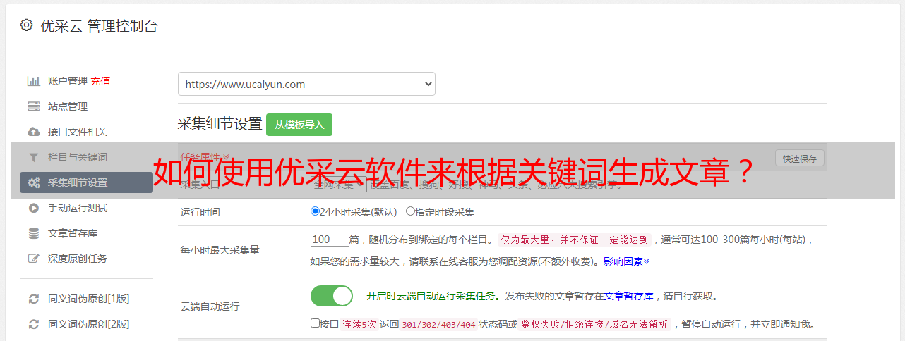 首先,打开优采云官网,www.ucaiyun.com,注册一个账号,即可使用优采云软件的全部功能。在登录的界面上,你可以输入某个关键词来生成文章。