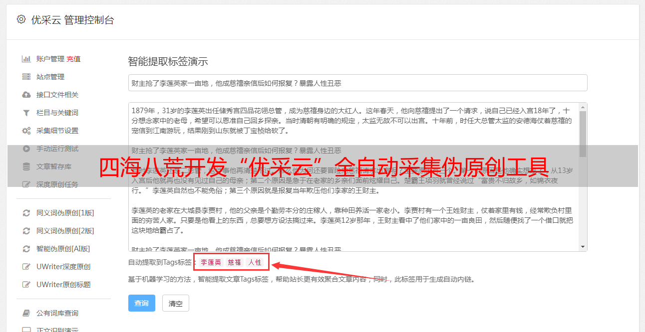 为了解决这个问题,上市公司四海八荒信息技术*敏*感*词*特别开发了“优采云”全自动采集伪原创工具,该工具能够快速、低成本、高效地采集大量优质干净的内容,而且能够根据用户的要求生成伪原创的文章,从而大大地提升用户体验。