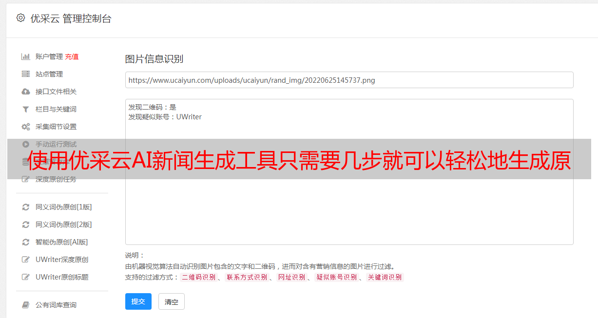 此外,优采云AI新闻生成工具具有图片识别功能,同样可以帮助用户减少大量时间和人力成本。其中包含多种图片识别技术,如图像特征识别、图像语义识别、图像相似度识别等,可以帮助用户根据图片内容快速找出相应信息并将之转化为文字形式进行使用。