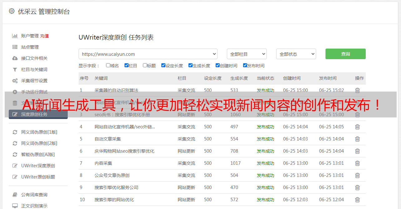 这时就出现了优采云 AI 新闻生成工具。优采云是一家集 AI 和大数据于一体的数字化服务平台。通过优采云,用户可以使用 AI 技术来快速生成新闻内容,并根据不同需要进行分析、处理。