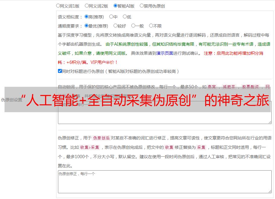 此外,优采云还能够根据用户不同的需要对已生成的文章进行调整和修改。例如,可以对语义强度进行微调(即将生成文章中词语中强度进行微调)、文章样式修改、核心关键字手工修改等。甚至可以在保留原始含义的情况下对文章进行大幅度修改。