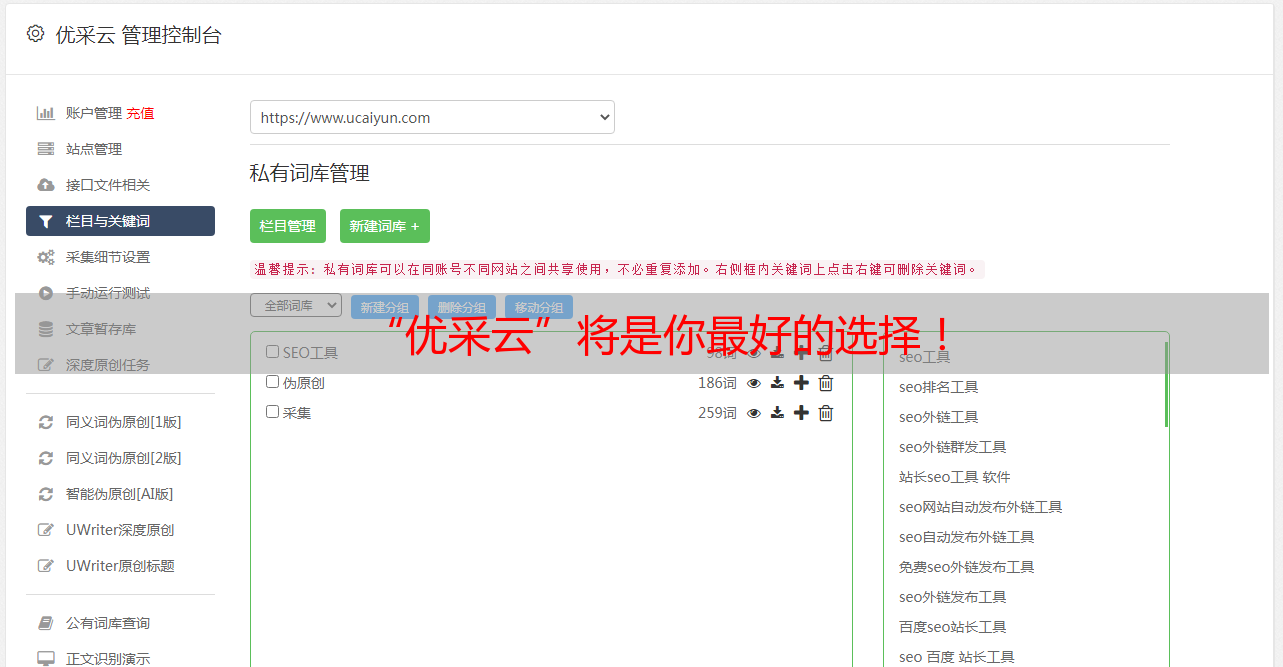 优采云是一款强大而实用的全自动采集伪原创工具,能够帮助用户快速搜索、采集、筛选、收录各种不同文章和内容。此外,它还可以帮助用户根据预设关键词,快速生成一定量高品质、独一无二的文章,体现出与真实原创相近的风格和特征。