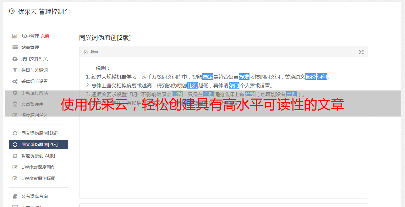 首先,优采云具备强大的文章生成功能。它通过人工智能技术提供丰富而强大的内容库和智能翻译功能,将原始的内容快速转化为各类不同语言的文章。同时,用户也可以对原始内容进行直接修改和扩展,从而有效地提升原创性和独特性。