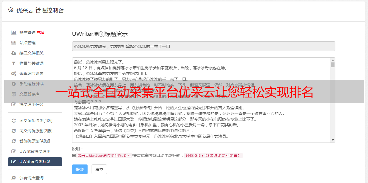 在这种情况下,一站式全自动采集平台优采云就是它们的救命稻草。优采云是一个全新的文章采集系统,可以帮助企业迅速和有效地实现排名。此外,它还可以帮助企业减少文章采集时间和成本,从而节省大量时间和成本。