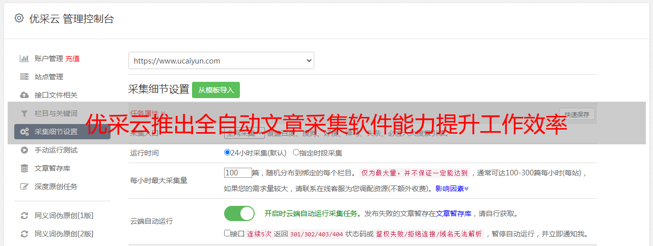 总之,使用优采云的全自动文章采集工具,不但能够有效地减少人工成本和时间成本;而且可以保证数据的有效性和真实性。不但能够尽快将海量信息准确地录入制作成新闻及产品内容库中使用;同时也可以实时探测市场舆情情况并洞察市场脉动(www.ucaiyun.com)。