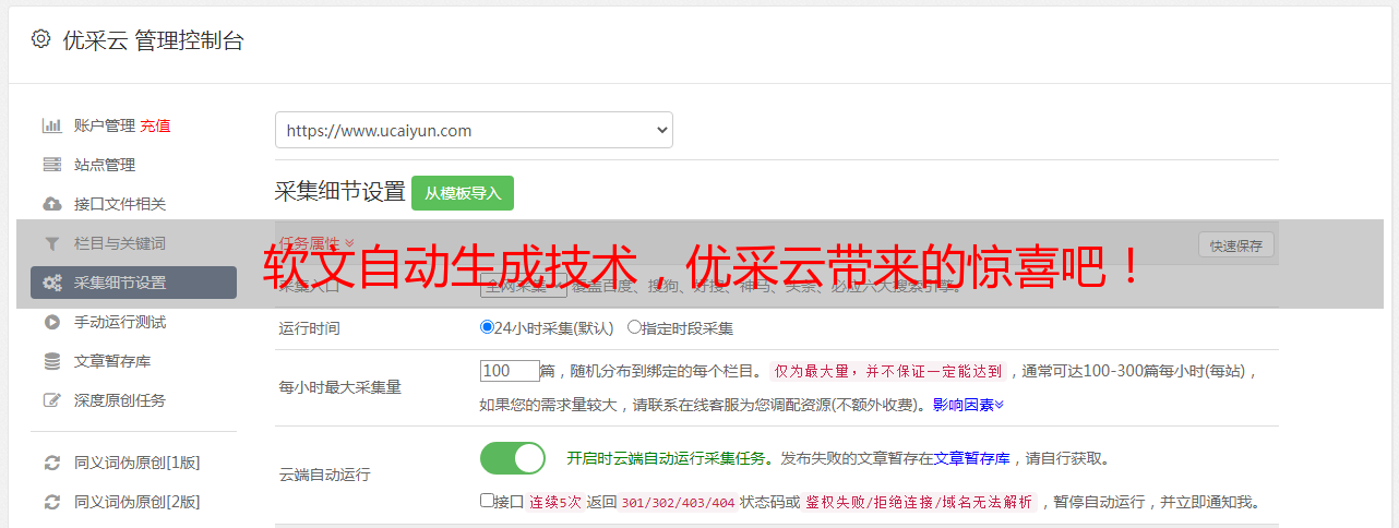 总之,优采云是一款将行业资讯、实时报道、去水印、一键发布、批量审核等服务集合在一起的强大工具;它不仅能够帮助用户快速生成有效软文内容,而且使得新闻对外分发也易如反掌。想了解更多信息?请前往www.ucaiyun.com 来体验优采云带来的惊喜吧~