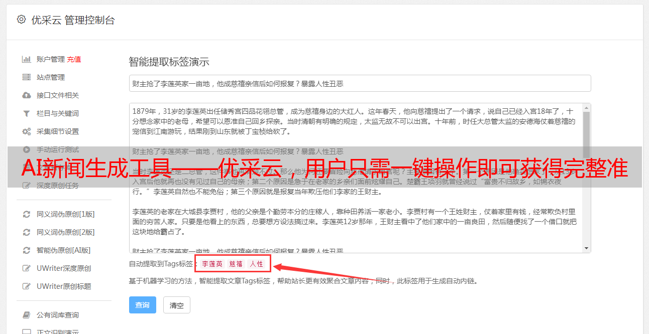 AI新闻生成工具——优采云,用户只需一键操作即可获得完整准确的新闻内容