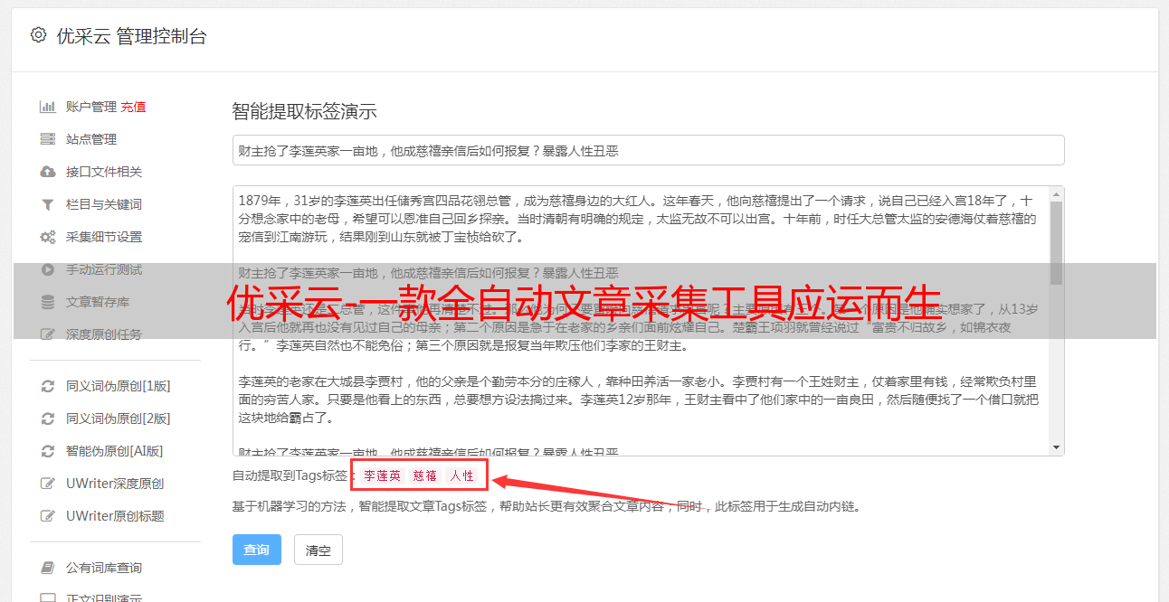 这时,优采云--一款全自动文章采集软件就应运而生了。它能够帮助企业快速、高效地采集新鲜、活跃的内容,而且它还可以使用AI/NLP技术来识别正确、清晰的内容,从而大大减少企业审核和编辑文章的时间。