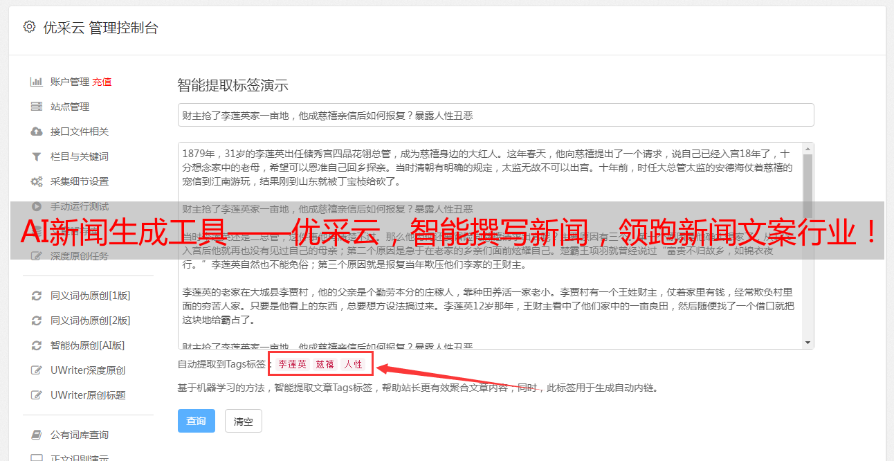 总而言之,优采云作为一个AI新闻生成工具而存在。它带来了便利性、效率性、准确性三大好处。它不仅可以帮助用户快速生成大量内容并进行内容优化;同时也能够将语义和情感相结合;有效地帮助用户进行信息整合和资讯识别。如此一来便可以使得大量内容得以及时准确地生成并使用。如此强大的功能让优采云在人工智能+新闻行业领先起来!