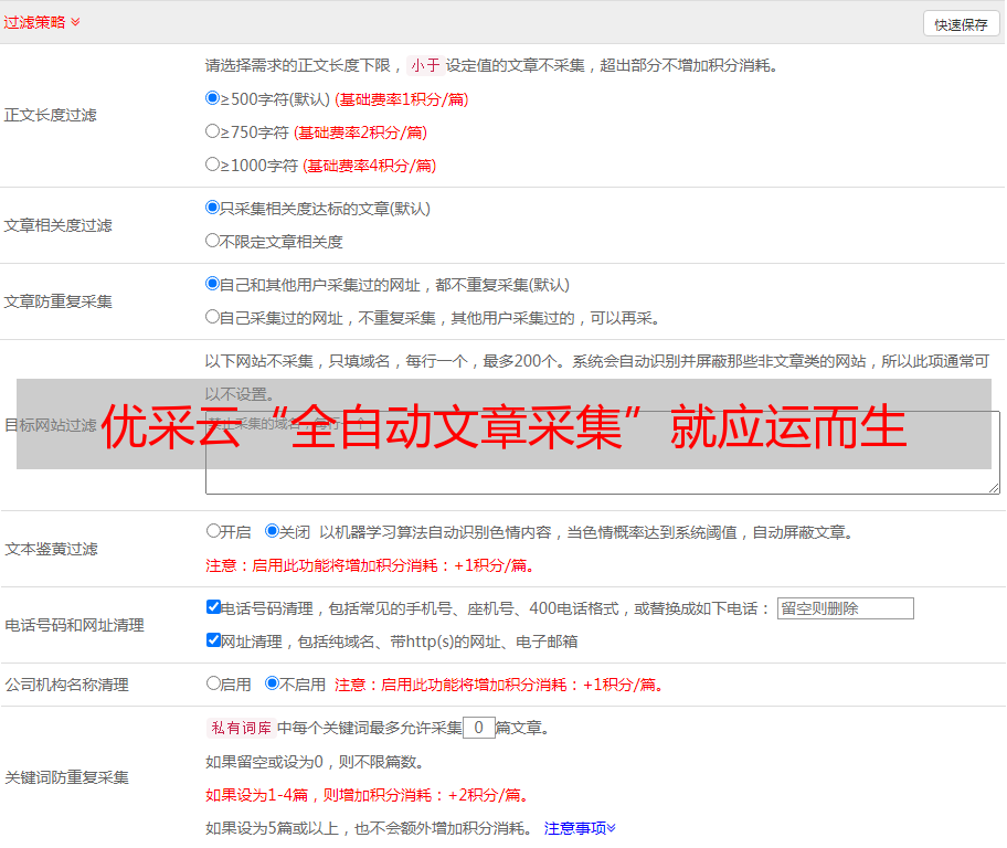 此时此刻,优采云“全自动文章采集”软件的出现,使这一切变得非常简单。优采云是由北京新时代数字科技*敏*感*词*开发的一款专业文章采集工具,它能够从各大门户、论坛、博客、微博等海量网站中寻找你想要的内容,既快又准。