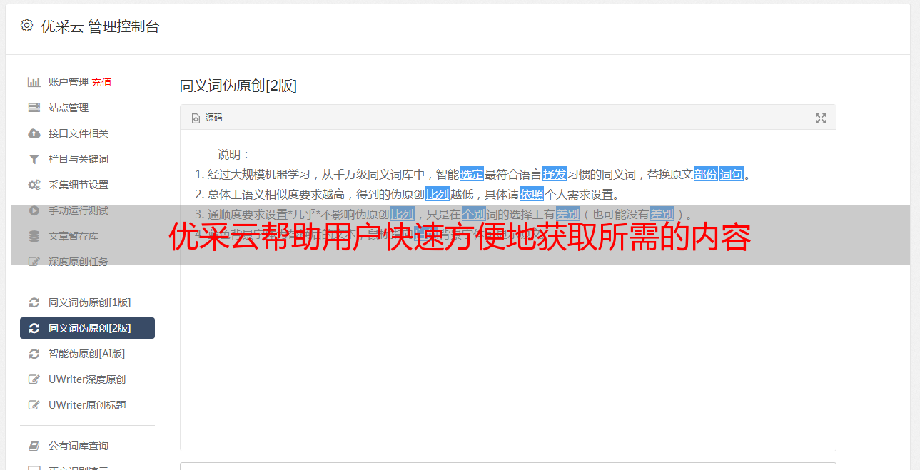优采云是一款专业的文章采集软件,它将帮助用户极大地减少文章采集的时间,从而使用户能够更好地利用时间来处理其他重要的工作。同时,优采云也不断完善其搜索引擎的能力,可以对各种网络上的内容进行快速准确的搜索,并支持多种格式的内容获取。此外,优采云还具备强大的内容去重功能,能够有效去除相同或者相似的内容,而且还可以根据用户预留的一些关键词来进行定制搜索。