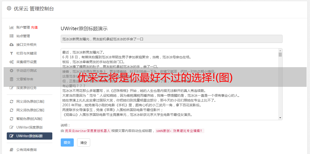 总之,优采云是一款强大实用且易上手的原创文章生成软件。它可以帮助用户快速生成出高质量、高校准度的原创文章。同时,它还具备强大的优化和校对功能,能够帮助用户有效避免错误考问题。如果你正在寻找一款专业原创文章生成工具,那么请不要再犹豫了——就是优采云!它将是你最好不过的选择!此外,你还可以前往其官网www.ucaiyun.com 进行详细了解。