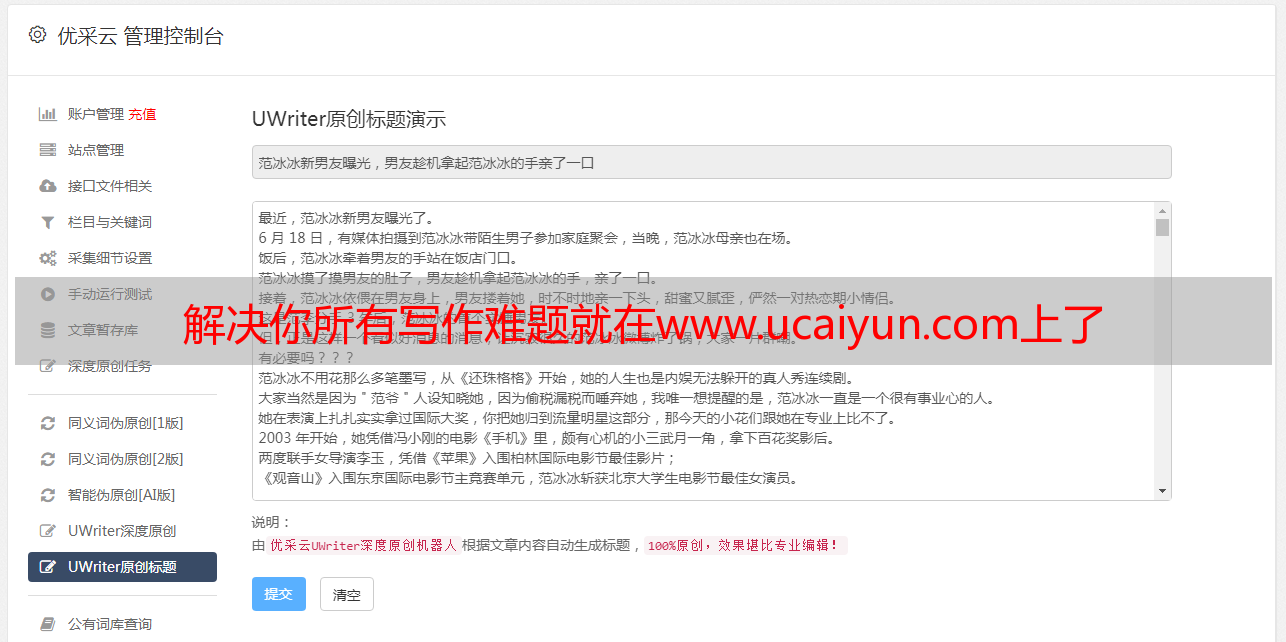 因此,优采云正在逐步受到关注和应用。它不仅能在写作效率上大大提升市民们的工作效率,而且也能保证所生成出来的文章内容高度独特、有原创性。如果你正在寻找一个好用、强大、可靠、便捷的原创文章生成工具,优采云就是你最好的选择之一。解决你所有写作难题就在 www.ucaiyun.com 上了!