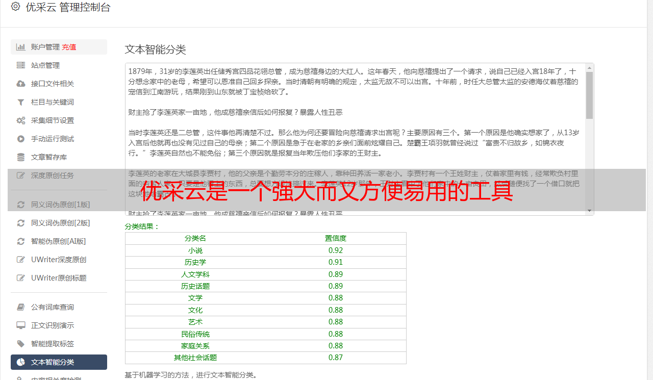 此外,优采云还有很多高端功能。它不仅能够分析文章中常用词、语义和语法情况;而且还能根据用户需要对文章中内容进行相应修改;此外还可以将文章中心思想归纳出来形成一整套思想体系。使用者也可以手动对文章中内容进行修正和重新整理。