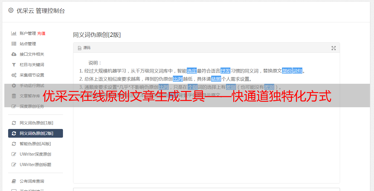 然而,原创文章是一件需要时间、精力以及相关知识储备的工作,而且很多时候我们也容易困惑、不知道如何写出好的原创文章。这时候就需要一款能够帮助我们在线快速生成原创文章的工具——优采云在线原创文章生成工具。