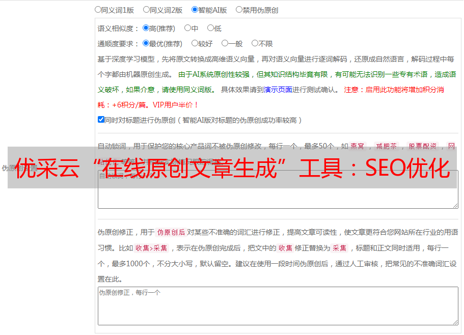 此外,SEO 优化还有诸多高效助力功能来帮助你对所生成出来的原创内容进行快速修改,例如:其内部集成有一套专业高效而又超强大耐用性高度可定制化并且具有强大语意特征识别功能的“ AI 精准剪裁”助力,帮助你快速定位你所要剪裁/修正/补充的文章部位以及高效剪裁/修正/补充所所要修正内容,这样一来就大大地方便了用户对所生成的原创内容进行快速修正,从而使你在上传时能处理出极为优质且具有独特性和高度去标识性的原创内容;这么能够在不同浏览者眼中显得极为特立独行,从而使你所生成出来的文章得以广泛浏览.