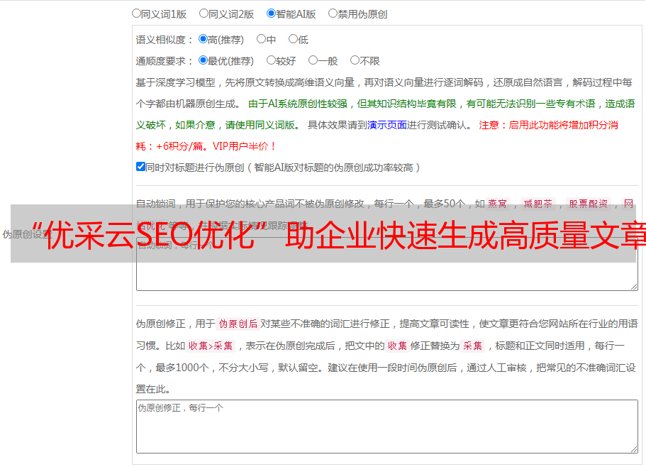 “优采云SEO优化”是一款将AI+SEO+内容三者有机结合在一起的新一代文章生成工具。如果您想要快速便捷地创作出高质量的文章内容来帮助企业数字化营销,不妨尝试使用“优采云SEO优化”工具:www.ucaiyun.
