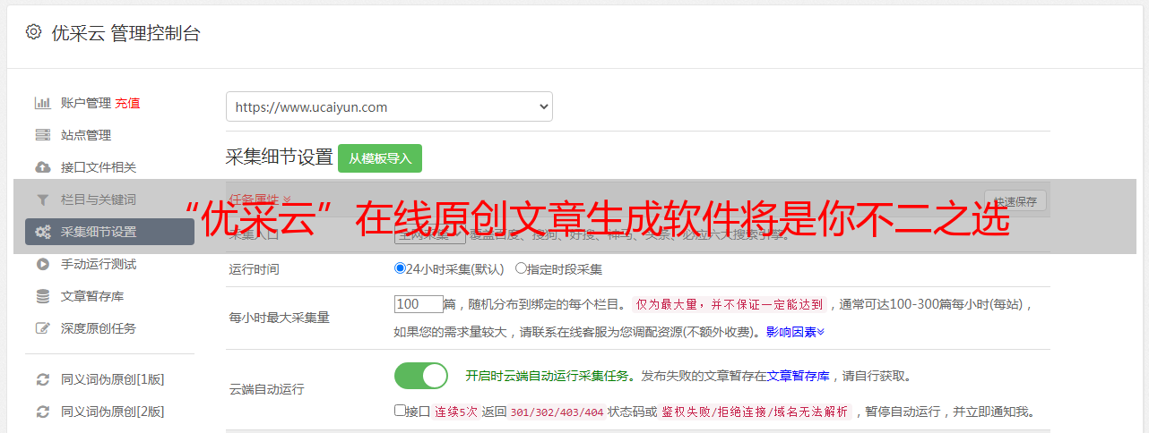 总之,“优采云”的在线原创文章生成软件是一款非常方便、高效、实用的工具。它不仅能够帮助用户快速生成大量原创文章,而且还能够帮助用户生成SEO优化后的文章。如果你想要快速、高效、有效地帮助你的企业扩大影响力、引流量并提升排名,那么“优采云”将是你不二之选。快来官网www.ucaiyun.com注册一个账号吧!