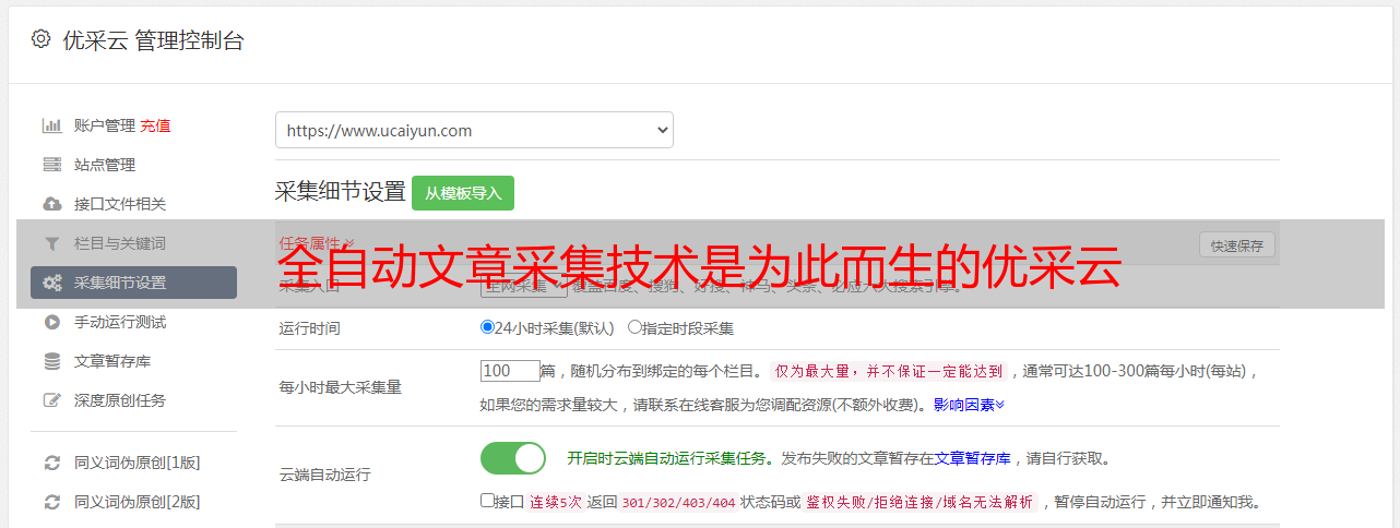 总之,优野云是一款功能强大、易用性好、性能卓越、实用性广泛的全自动文章采集软件。它不仅能够帮助用户快速高效地找到有价值的文章信息,而且还能对已采集到信息进行SEO优化处理:使得信息在不同搜索引擎中都能得到快速呈现。如果你想要一套强大好用的全自动文章采集工具,不如试试优野云吧——它是一个省时省力、使用方便、低门槛高效率的“神器”。你可以通过www.ucaiyun.com 来了解和下载这套超强工具哦~