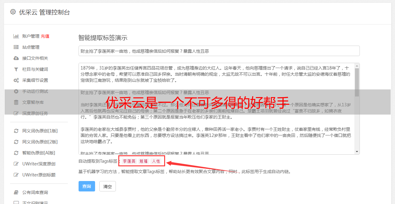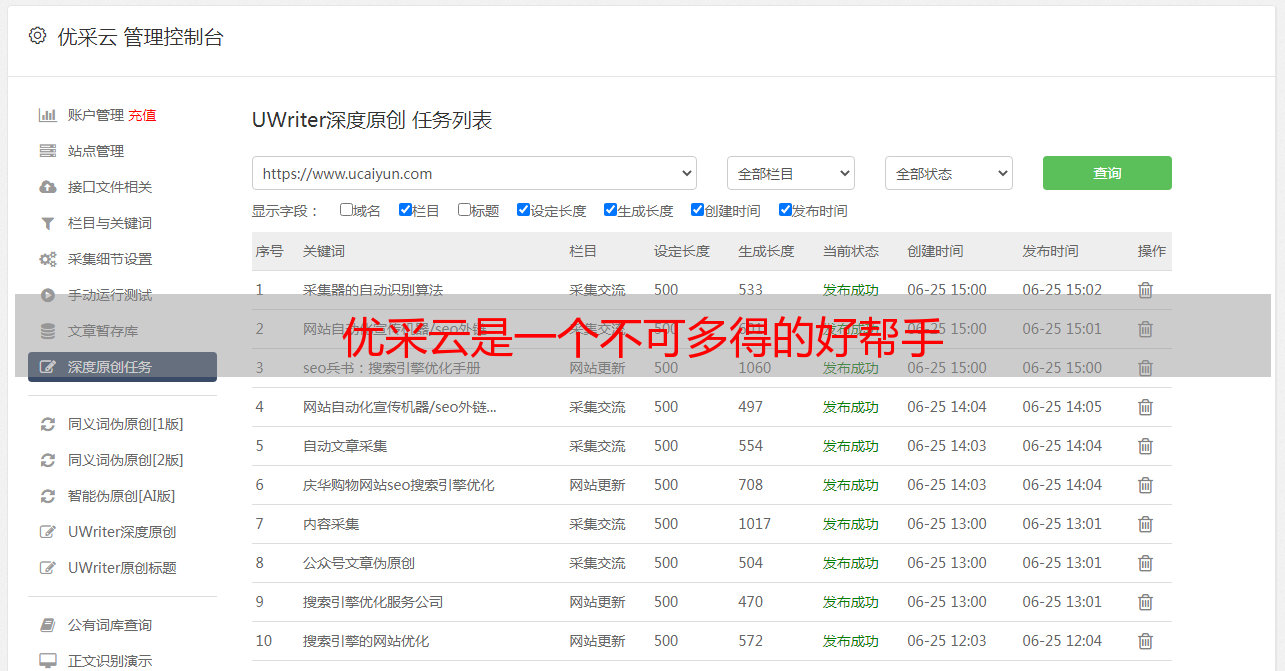 通过使用优采云这一强大而先进的工具,不仅可以快速生成高质量文章,而且可以帮助企业降低人工成本、减少时间浪费、有效地将企业信息传递出去。因此,优采云将是一个不可多得的好帮手。