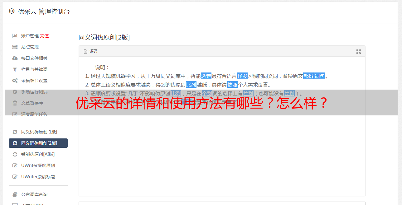 优采云的界面设计也十分人性化,用户无需学习就可以上手使用。它可以实时监测所有已采集内容的原创性、SEO优化等情况,并能够根据用户的要求进行定时采集、定时更新内容等工作。