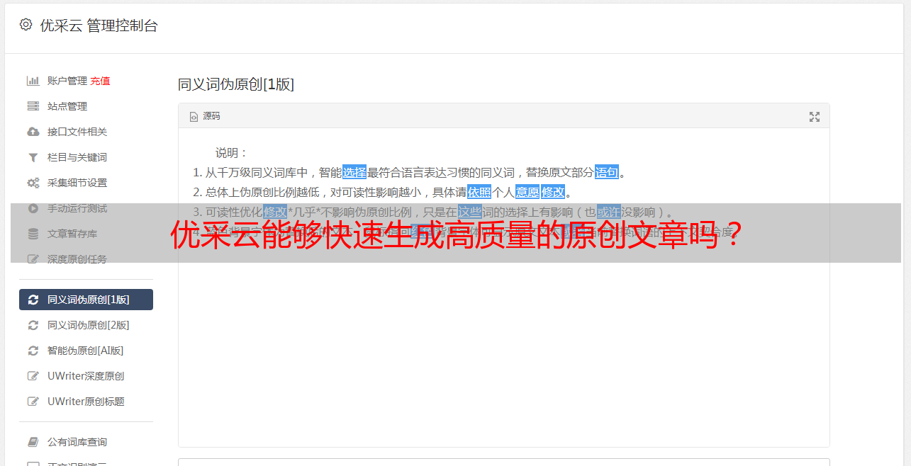 优采云 发布时间: 2023-01-07 01:12随着互联网的发展,在线原创文章生成已成为一种重要的内容创作方式。优采云在这方面拥有众多优势,可以帮助用户迅速生成高质量的原创文章,具有SEO优化功能,官网www.ucaiyun.com。