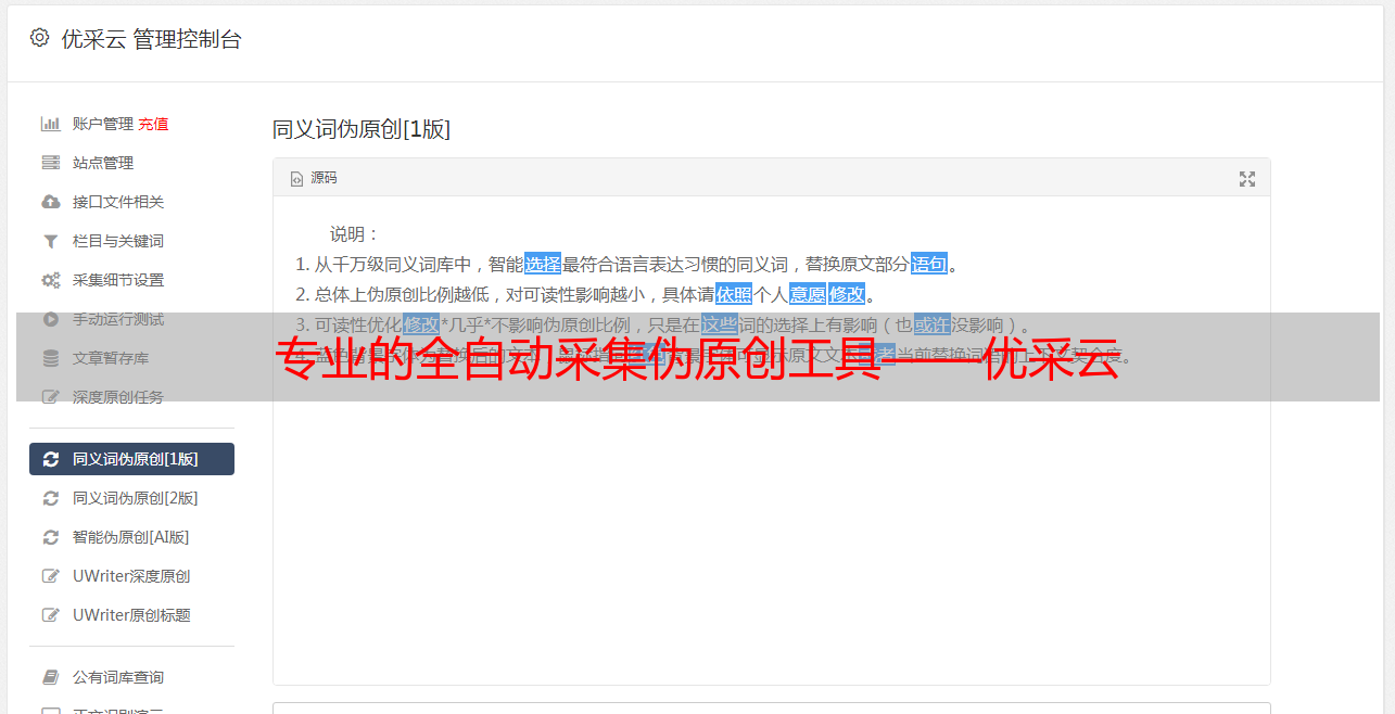 优采云是一款专门针对SEO优化的全自动采集伪原创工具。它可以帮助用户快速、准确地完成采集任务,并能够实现语义深度分析、智能生成新内容等多项功能。其中,语义深度分析可以帮助用户快速找出文章中存在的问题,并能够根据需要进行修改和补充;而智能生成新内容功能则可以根据用户输入的关键词、句子等信息,快速生成高质量、有代表性的新内容。