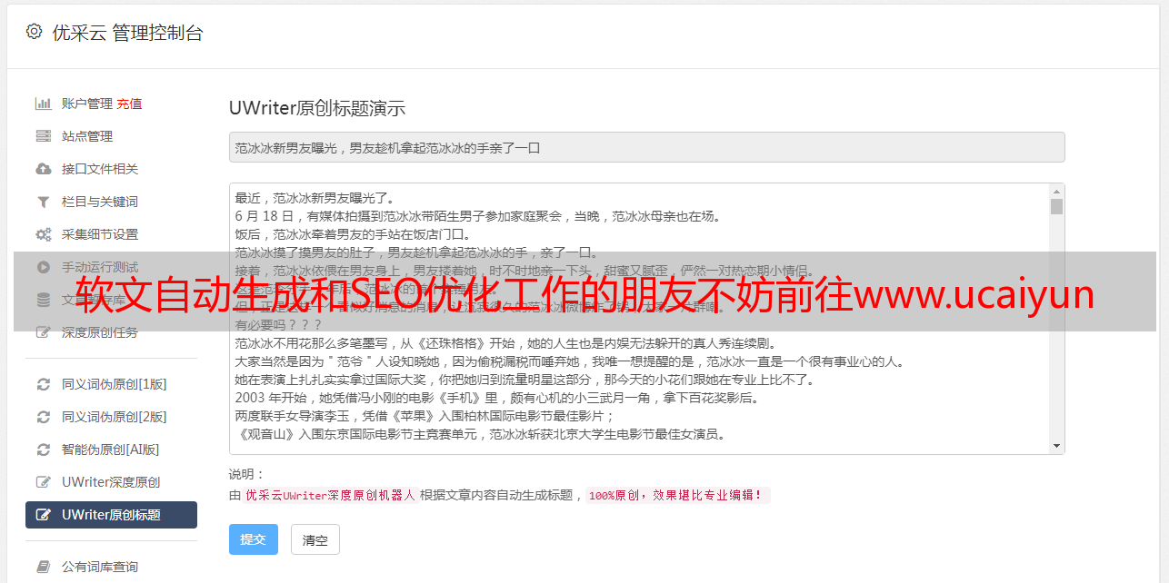 软文自动生成和SEO优化工作的朋友不妨前往www.ucaiyun