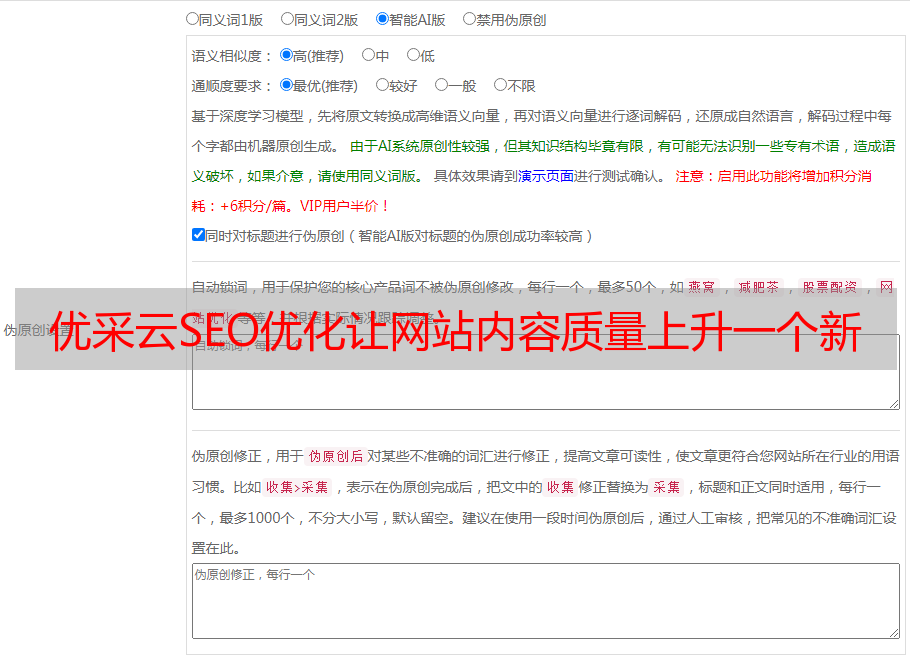 优采云SEO优化是一款全自动采集伪原创的内容生产工具。它能够从各大信息平台上快速采集各种有价值的信息,并对信息进行文字处理、图片处理、词语重新组合和关键词优化,使得原始信息变得独特而有价值。最后将生成的文章可以直接发布到各大新闻、博客、微博等平台上,大大减少了内容制作时间。