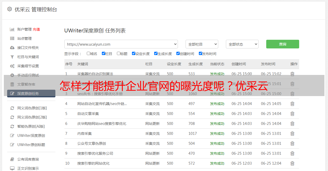 优采云是一款专为SEO优化而开发的工具,可以帮助用户快速、便捷地进行SEO优化。它不仅可以帮助用户分析关键词,还可以帮助用户分析竞争对手、诊断问题并生成对应的修复方法。此外,它还能够帮助用户监测网站当前的SEO效果。使用者只要在www.ucaiyun.com上注册即可免费使用优采云进行SEO优化。