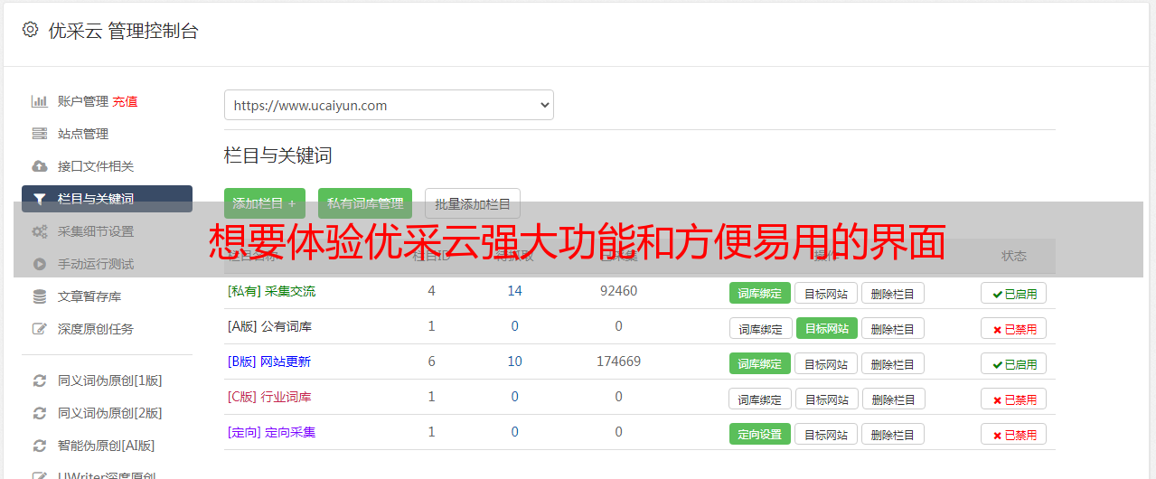 此外,优采云也为用户提供了友好易用的界面:用户只需要在界面上选定要生成文章所要使用的关键词、以及常用语法格式就能够快速生成一篇有专业水准的文章。而优采云还可以将生成好的文章及时地发布到各大平台上去,省去了用户手动去发布文章所耗费的时间。