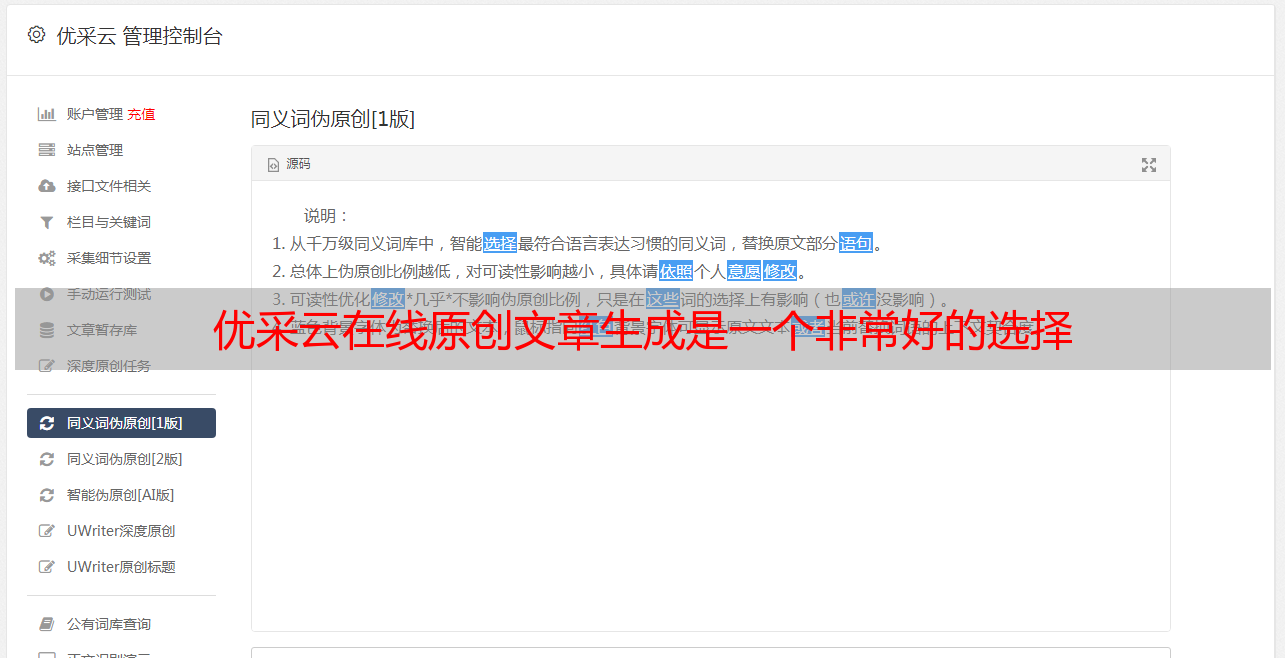 总之,优采云在线原创文章生成是一个非常好的选择,能够帮助中小企业快速生成各类高质量原创文章,并通过SEO优化将这些文章快速带入用户眼前。如想要了解更多信息请访问www.ucaiyun.com 。