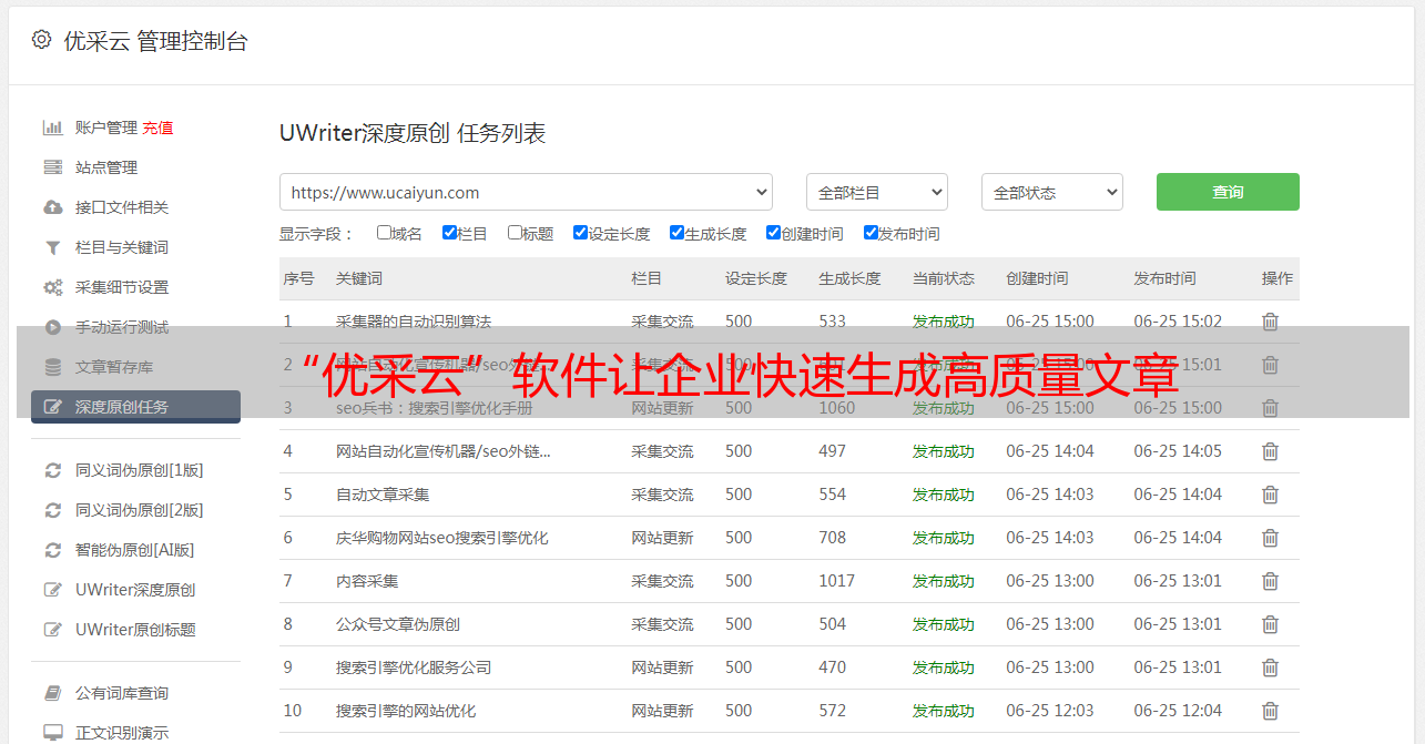 总之,“优采云”是一款强大的内容生成工具。它不仅能够快速生成高质量文章,而且还具备SEO优化和内容发布功能。如果你想找到一种快速、有效、高效地生成内容的方法,不妨去尝试一下“优采云”这款软件吧!它的官网是www.ucaiyun.com。