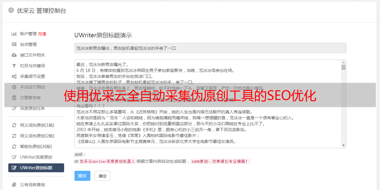 总之,使用优采云这款全自动采集伪原创工具不仅可以有效地避免内容被搜索引擎识别为重复内容而降权,而且还能帮助用户快速、准确地将文章进行SEO优化和各大社交媒体平台上的推广!如果想要尝试使用该工具,可以前往官网www.ucaiyun.com 了解详情。