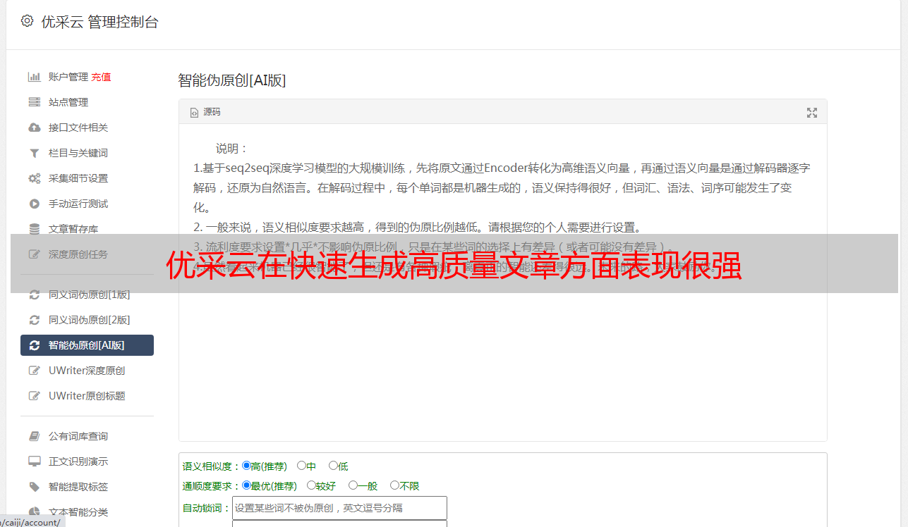 总之,随着AI和SEO优化的发展,人们可以使用优采云这样的软件来快速生成高质量原创文章。作为一个AI产品而言,优采云在快速生成高质量文章方面表现出很强的能力。如想要体验该软件带来的便利性与效率性,可前往官网www.ucaiyun.com 体验一番。