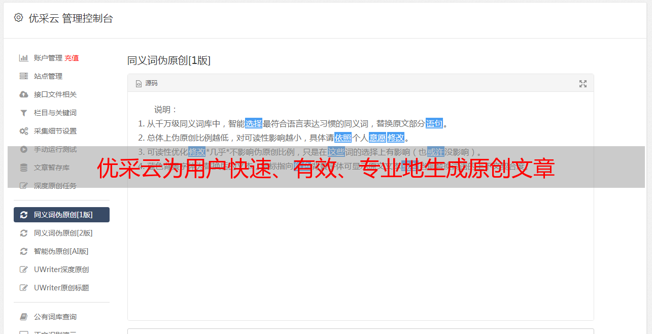 总之,优采云是一款功能强大、易用性强、SEO优化效果显著的在线原创文章生成软件。它可以帮助用户快速、有效地生成原创文章,并将其中所含内容显示在搜索引擎中,大大增加文章的流量和访问量。如果你也想要尝试使用优采云这款在线原创文章生成工具,不妨前往www.ucaiyun.com 了解详情吧!