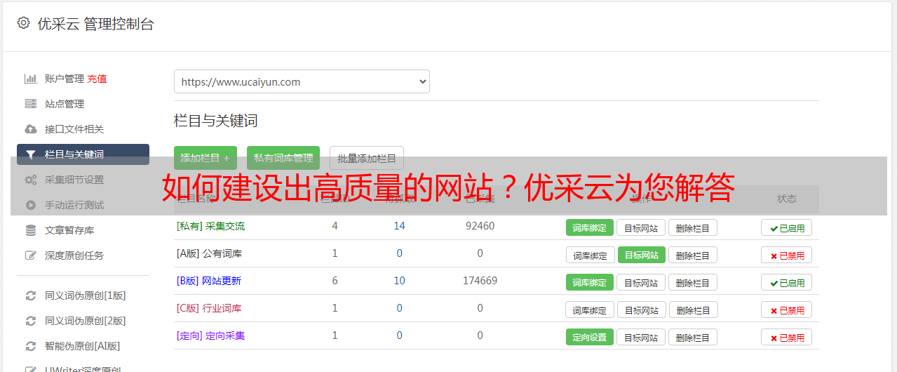 在这里提出一个解决方案——优采云。优采云是一款集网站制作、SEO优化、性能测试、安全监测于一体的服务型产品。它能够帮助用户快速构建一个优质的网站,并使用SEO优化服务将网站推广到大量客户面前。