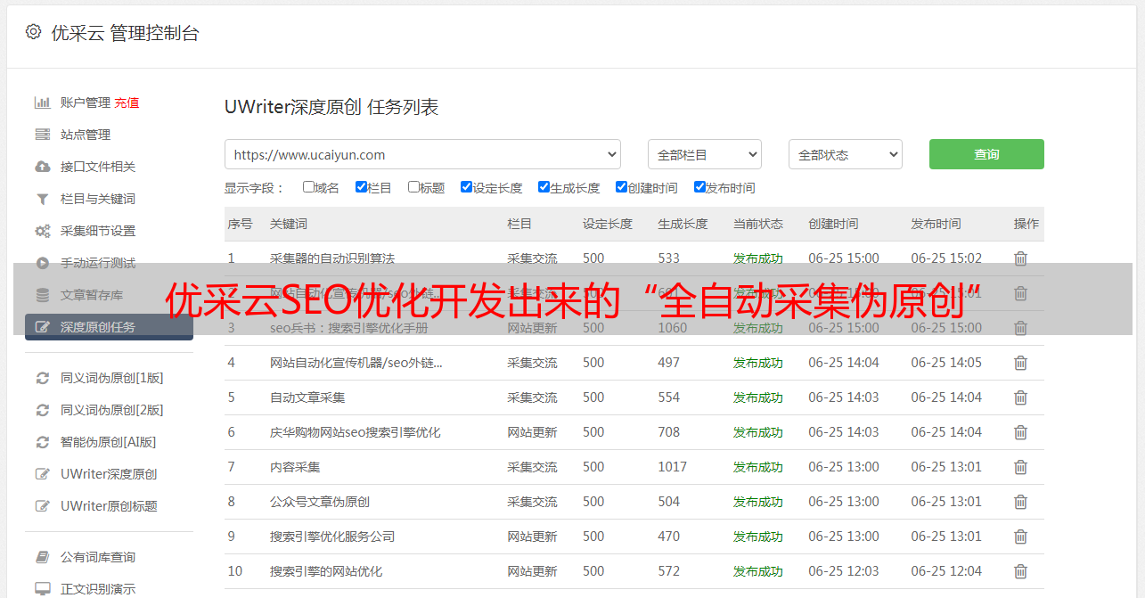 优采云SEO优化是一家专注于SEO优化服务的公司,他们开发出了一款叫做“全自动采集伪原创”的软件,该软件可以根据用户在官网www.ucaiyun.com上所选择的关键词,帮助用户快速地生成大量的伪原创文章。