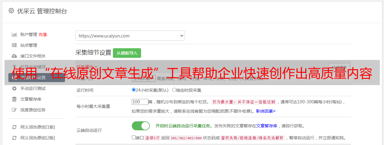 总之,使用“在线原创文章生成”工具是当前企业SEO 优化中不可或缺的一部分。如想了解详情请浏览官网www.ucaiyun.com 或者直接体验试用即可体验使用“在线原创文章生成”工具带来便捷、省时、省心、省力之乐趣!