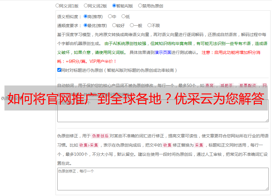 优采云 发布时间: 2023-01-08 20:32如今,随着互联网的发展,企业的官网已成为一家企业的形象窗口。它不仅是企业的展示平台,更是企业和客户之间沟通的桥梁。但如何将官网推广到全球各地?这就要求企业采用合适的SEO优化方式,以便获得最好的搜索引擎排名。