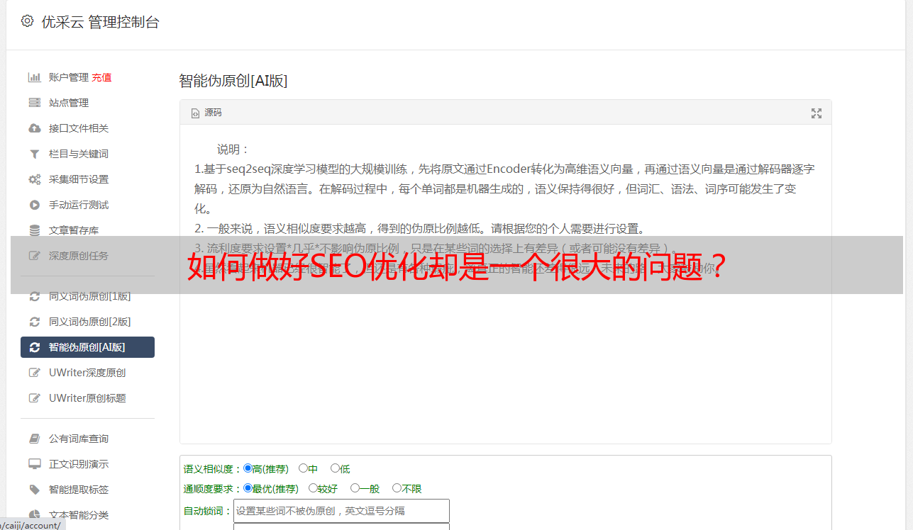 首先,作为SEO优化的基本要求,必须要有大量的高质量的原创内容,这样才能吸引更多的用户。但是,如何才能快速、高效地创作大量原创内容呢?这就是全自动采集伪原创技术应运而生。