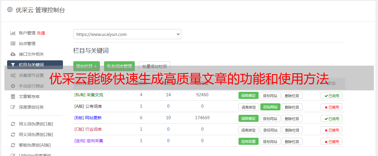 总之,优采云是一款功能强大、使用方便的文章创作工具。它不仅能够快速准确地生成高质量文章,而且还具有SEO优化功能。如果你正在寻找一款能够帮助你快速生成大量文章的工具,那么你就不妨试试优采云。它的官网是www.ucaiyun.com ,想要详细了解优采云的功能和使用方法,可以前往该网址来浏览相关信息。