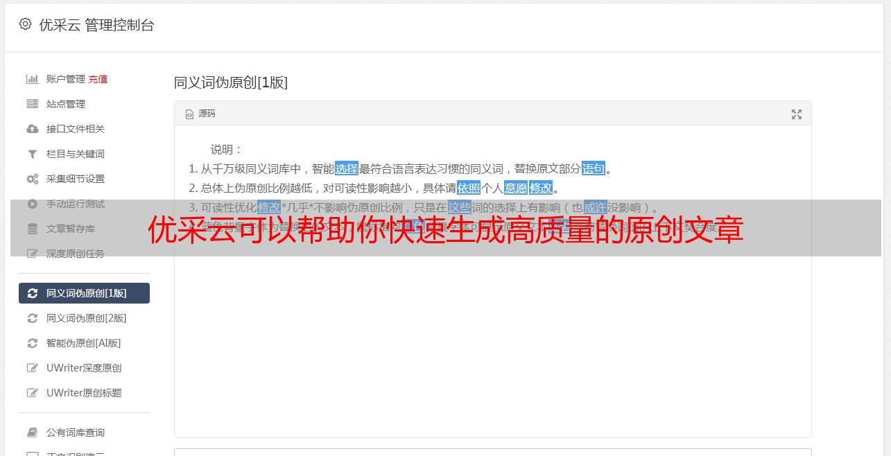 总之,优采云是一款功能强大、易于使用的SEO优化工具。它能够帮助用户快速生成高质量、SEO 优化的原创文章,从而帮助用户有效地宣传和宣传自己的品牌。想要了解更多关于优采云的信息,可以浏览它官网www.ucaiyun.com上相关内容。